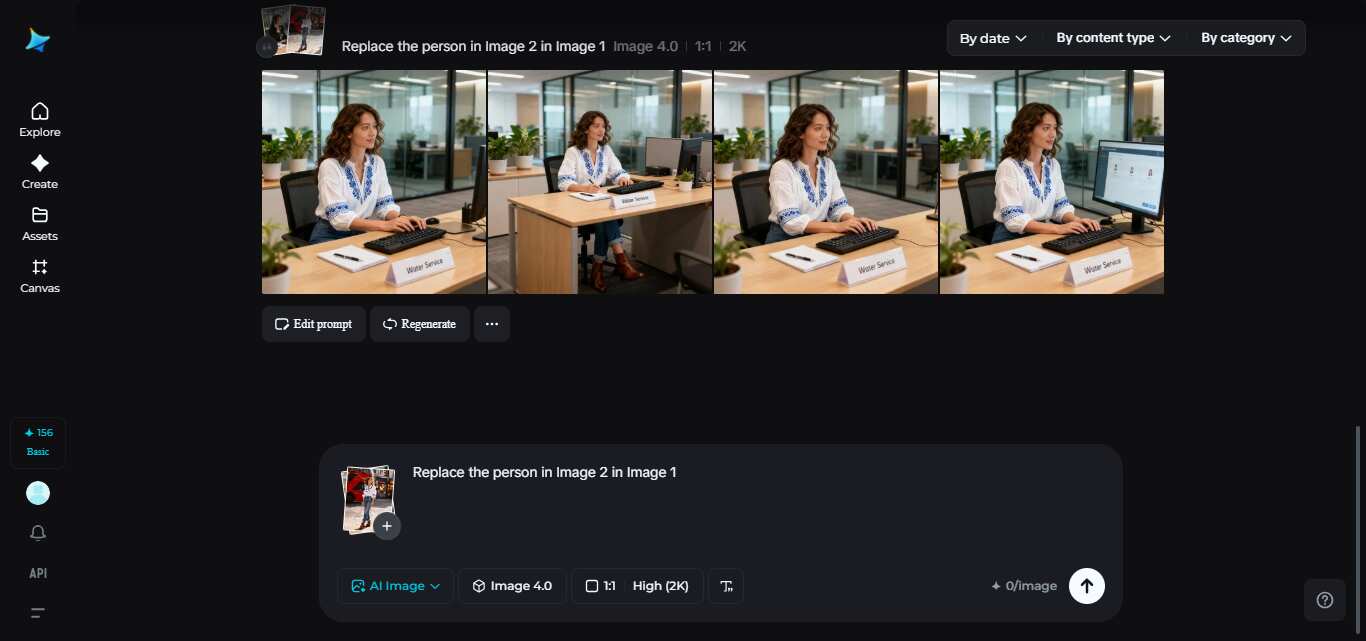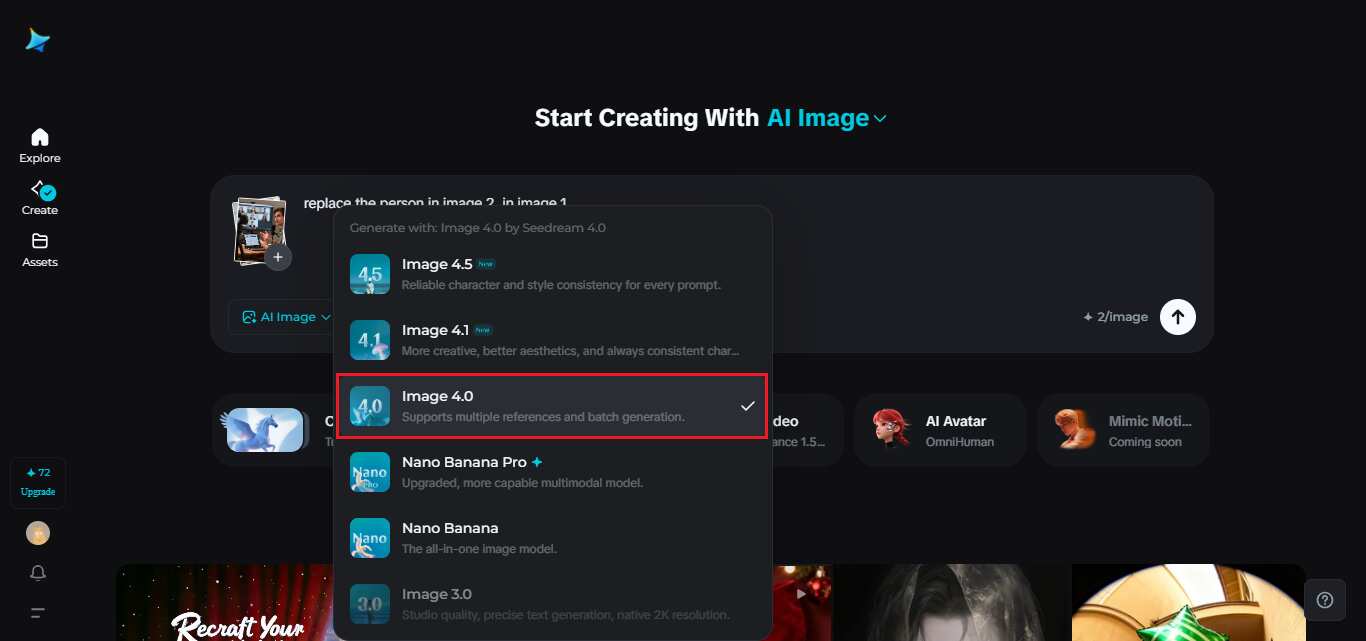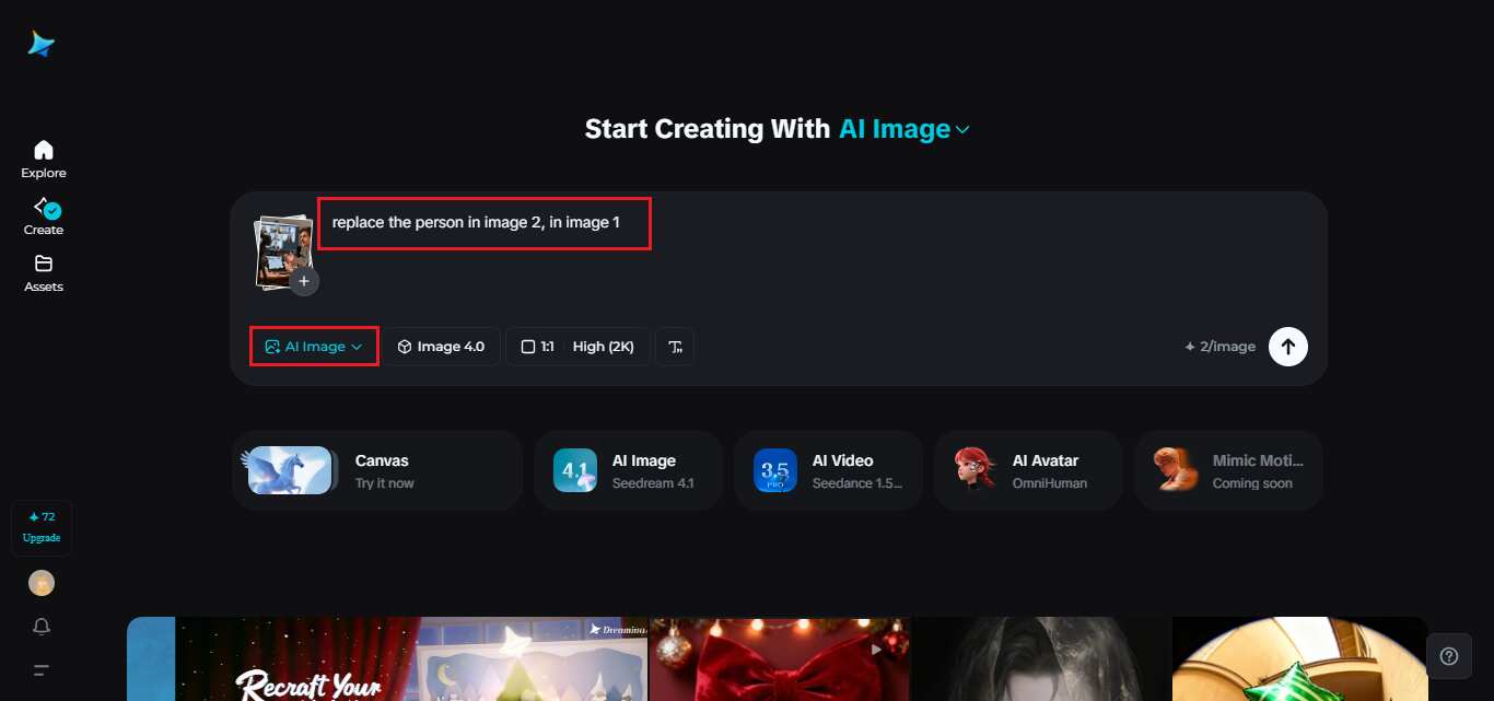 Begin with a visit to Dreamina’s site. Click on the image of AI, choose the + icon, and upload your base picture. This will serve as Image 1. You can then upload another image (Image 2), the face of which you would wish to apply first. Enter a prompt, such as “Replace the face in Image 1 with the person in Image 2,” and watch the image-to-image feature of Dreamina automatically perform the replacement to achieve a smooth transition. This approach would give realistic outcomes and make the process simple for beginners.